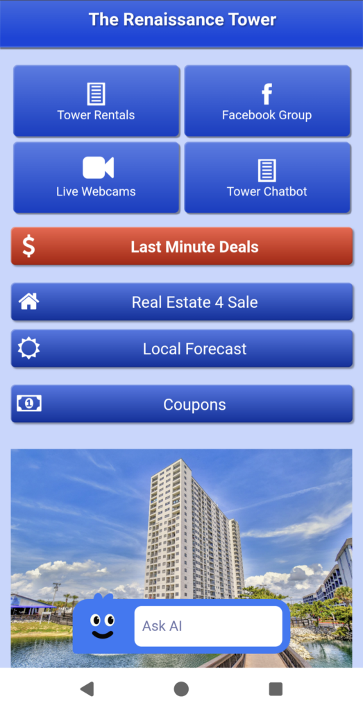 It was created to provide visitors enhanced mobile access to rentals and general information about the Renaissance Tower and the Myrtle Beach Resort.